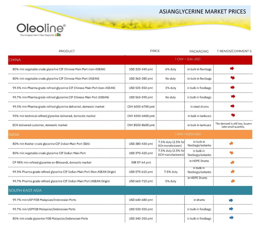 Asia is the largest glycerine market and Oleoline has an ongoing demand for publishing specific prices for these key markets. We have been working these past months on different versions of a report which we are now ready to put on the market. This weekly report, published on Fridays, will list the Chinese, Indian and South-East Asian crude and refined glycerine prices.